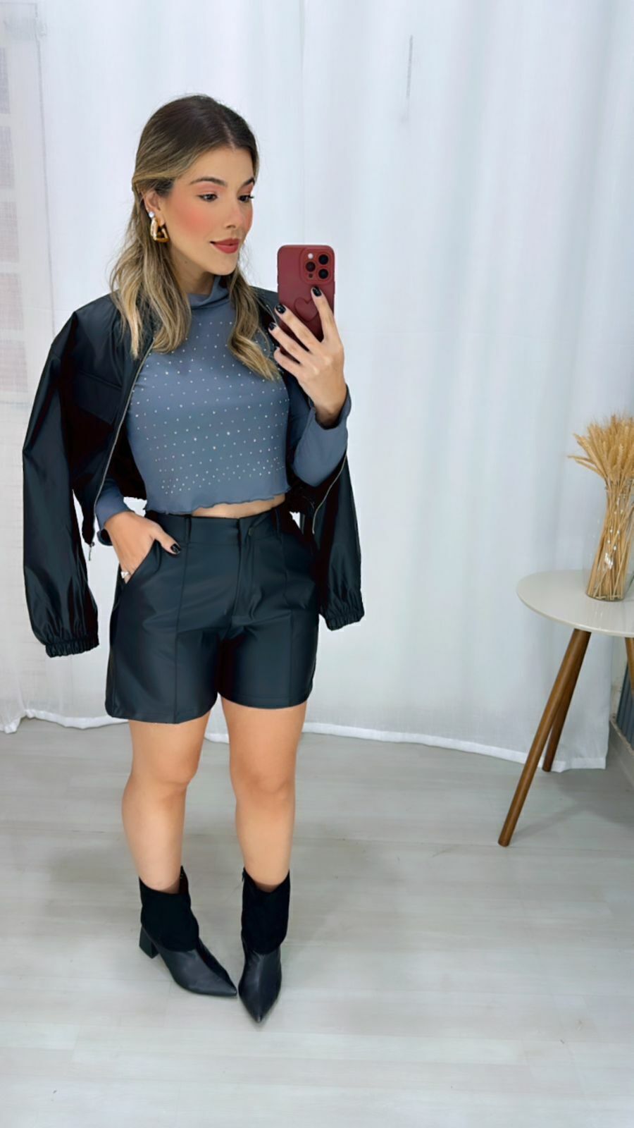 Jaqueta em P.U, possui zíper, elástico na cintura e bolsos.