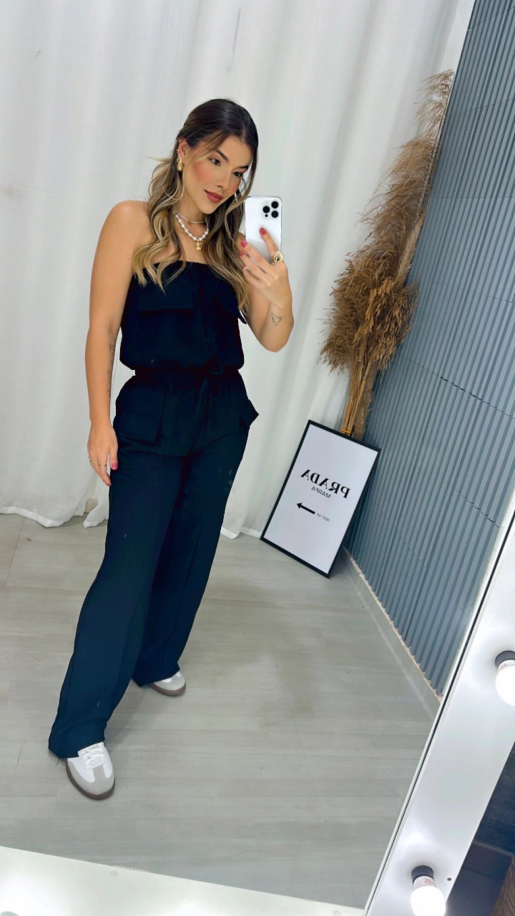 Possui bolso fake no busto e bolsos na calça