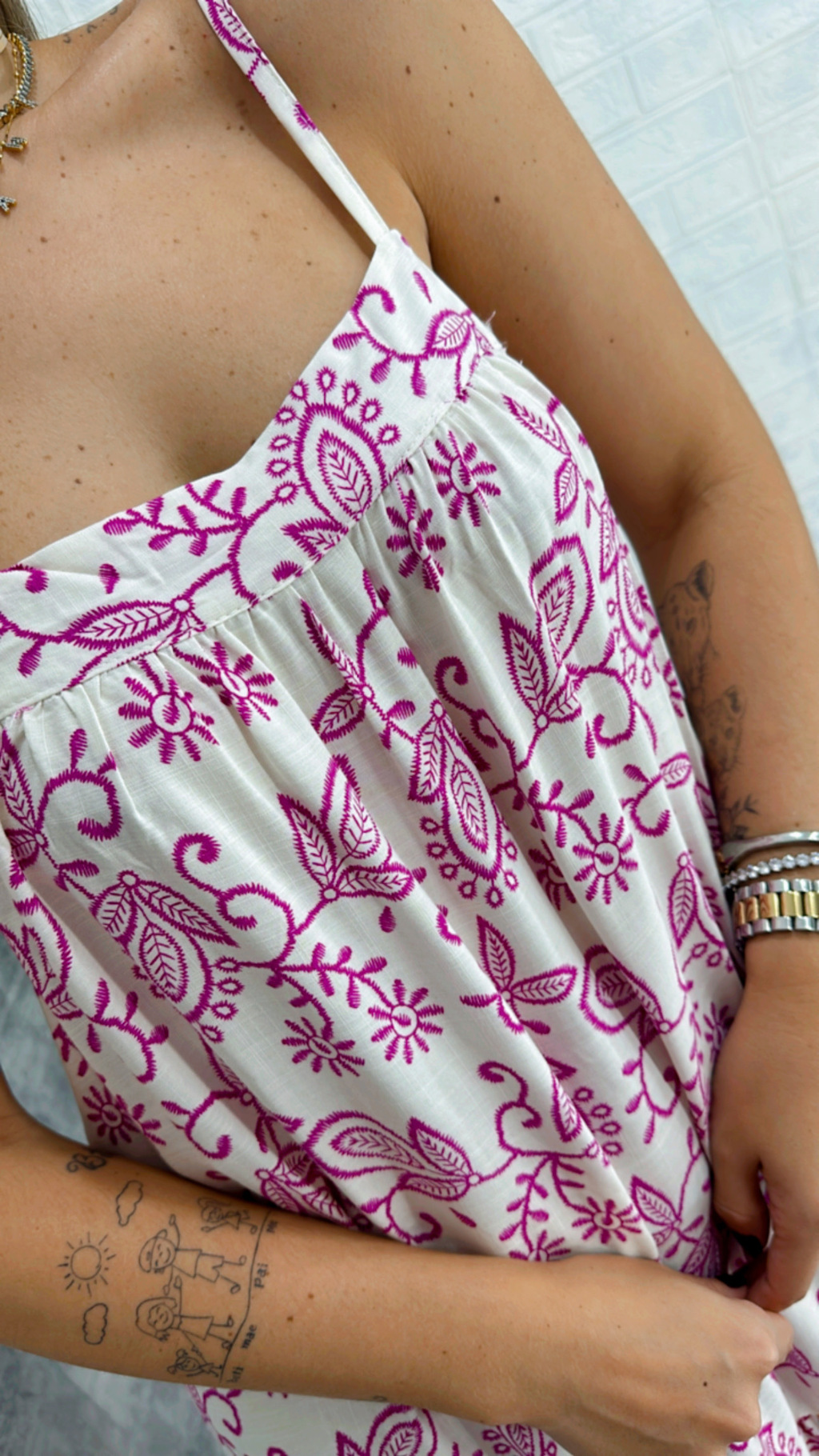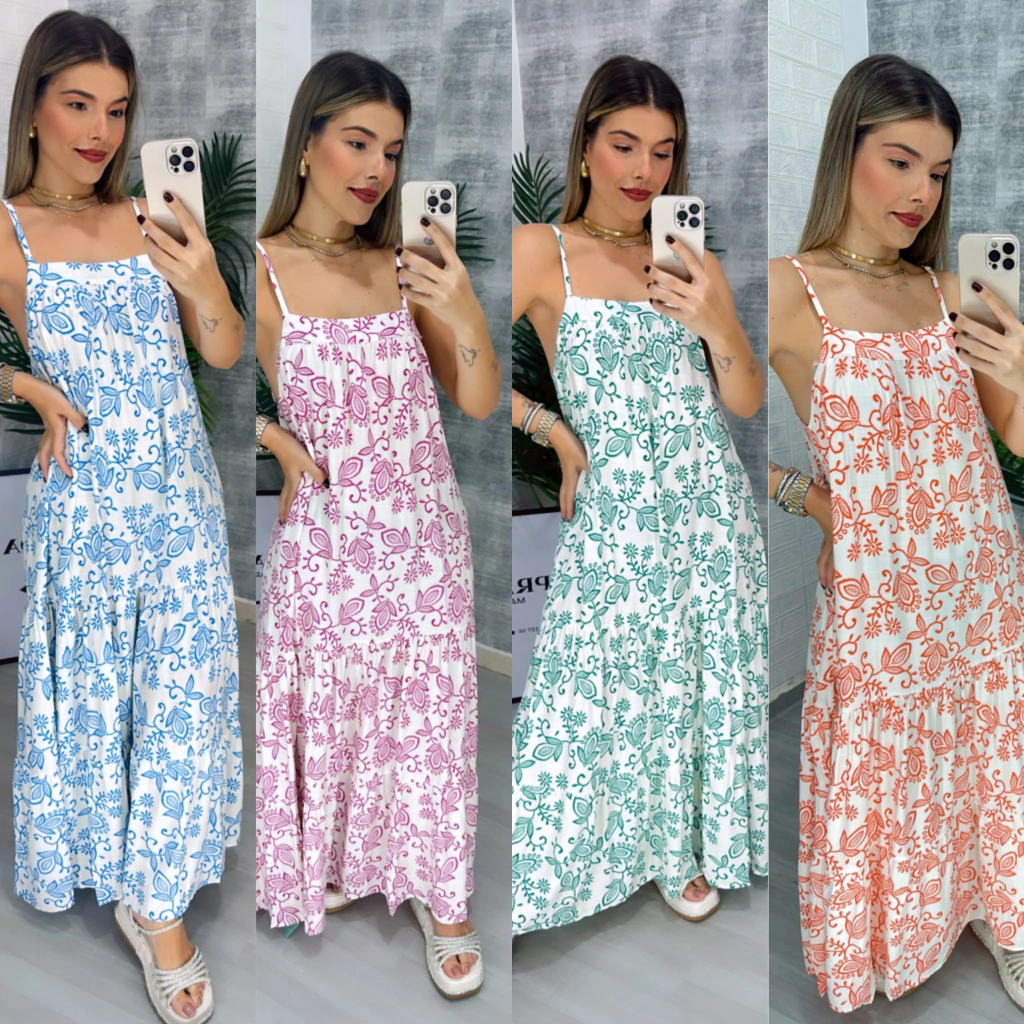 Vestido modelo longo, em tecido viscolinho, amplo e fluido, a alça é regulável e nas costas possui elástico.